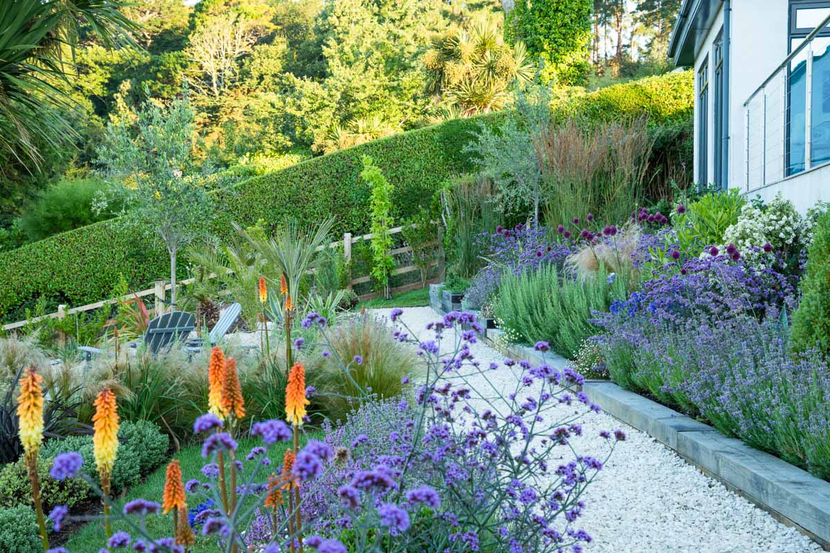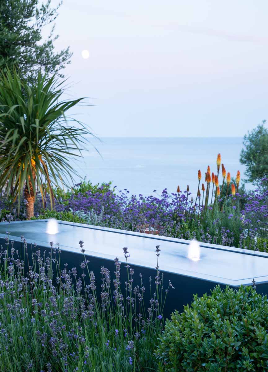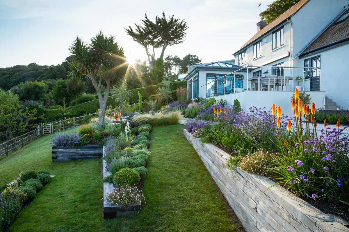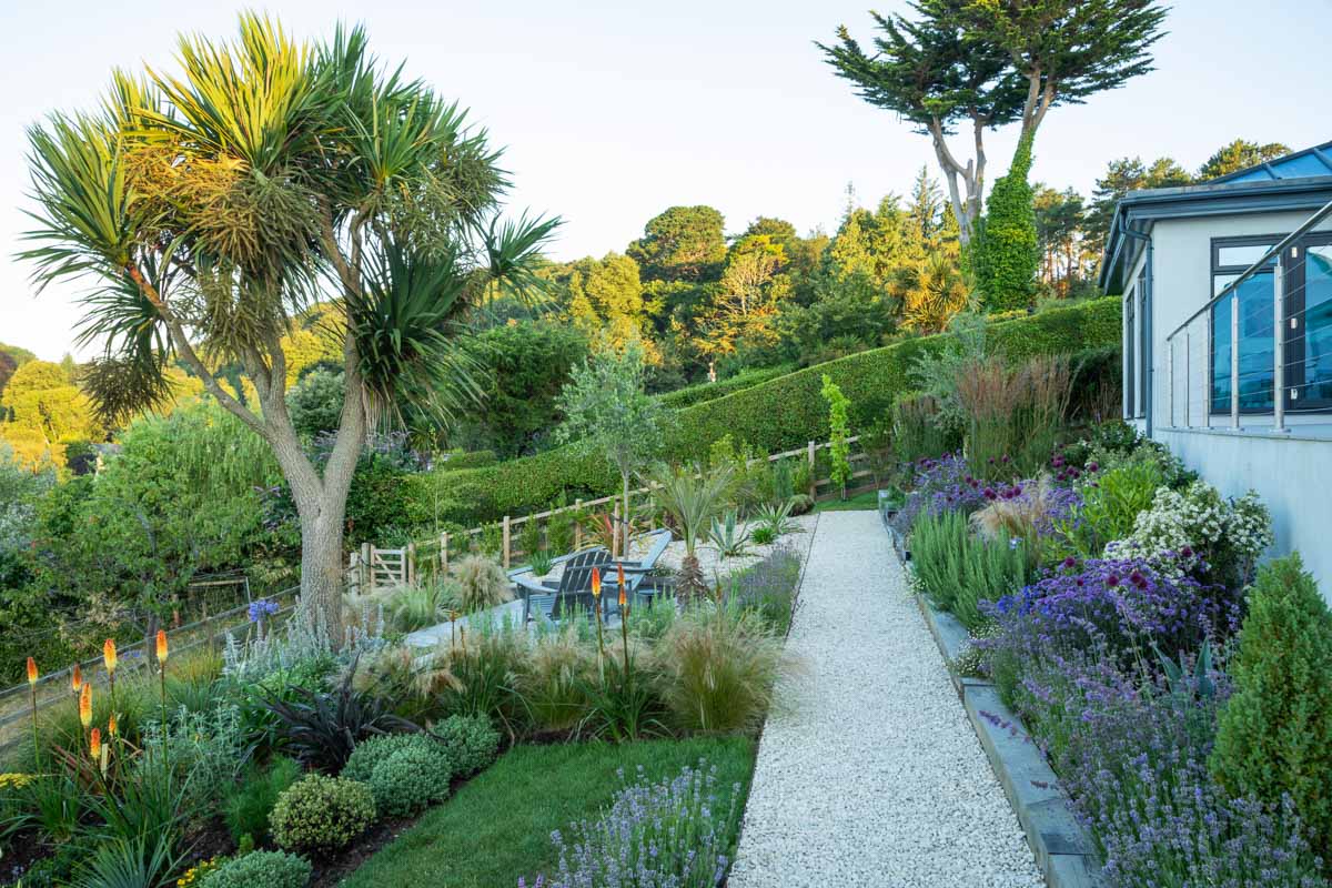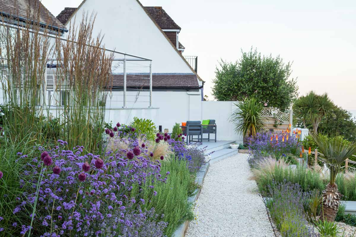 Located on the edge of Lyme Regis, Bay House has a small sloping garden that makes the most of its far reaching views over countryside and sea. Designer Alice Meacham has built an elegant set of terraces filled with coast tolerant planting, and a network of paths connecting several seating areas and a gravel garden on multiple levels. The grassed switchback path to the lower lawn is a particularly pleasing access solution on this steeply sloping site.