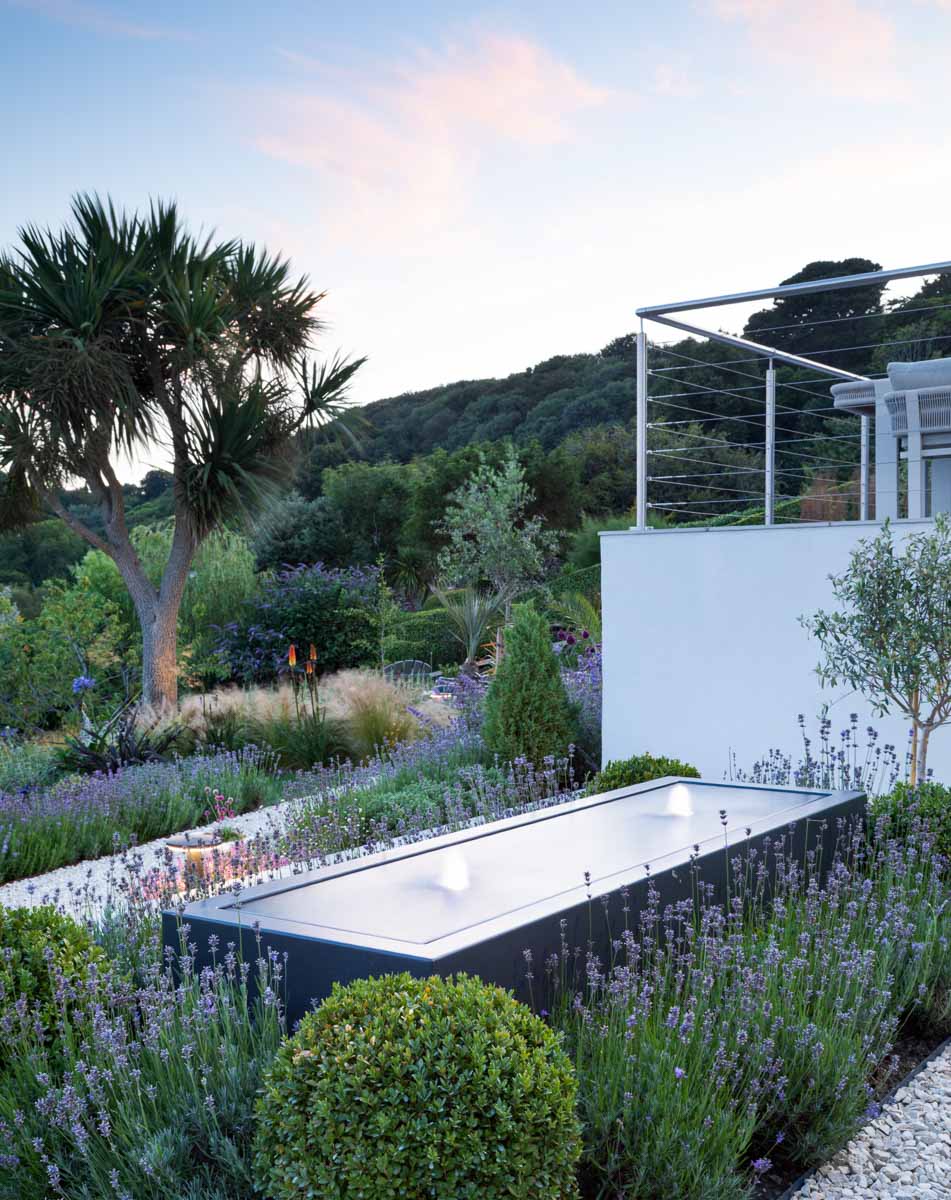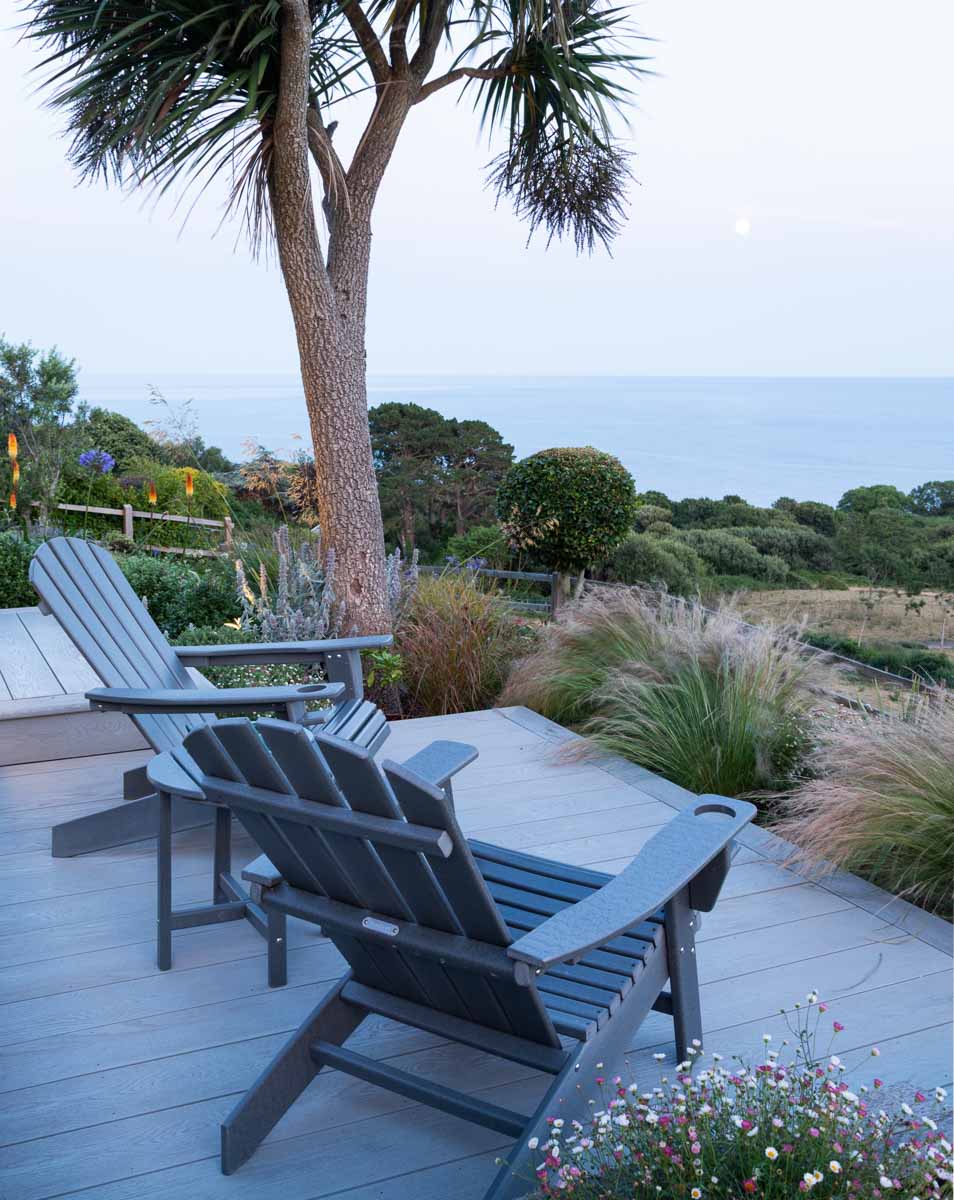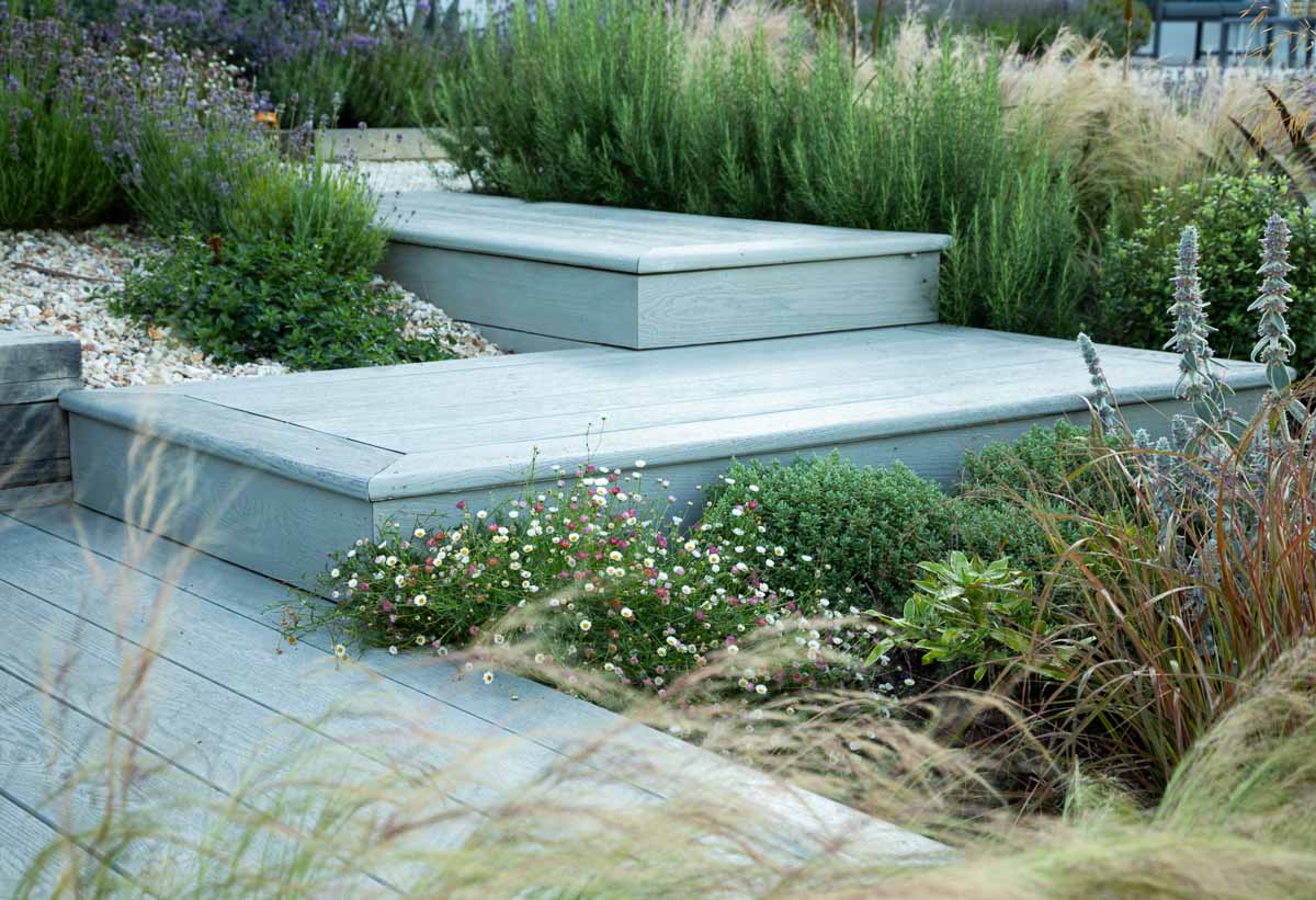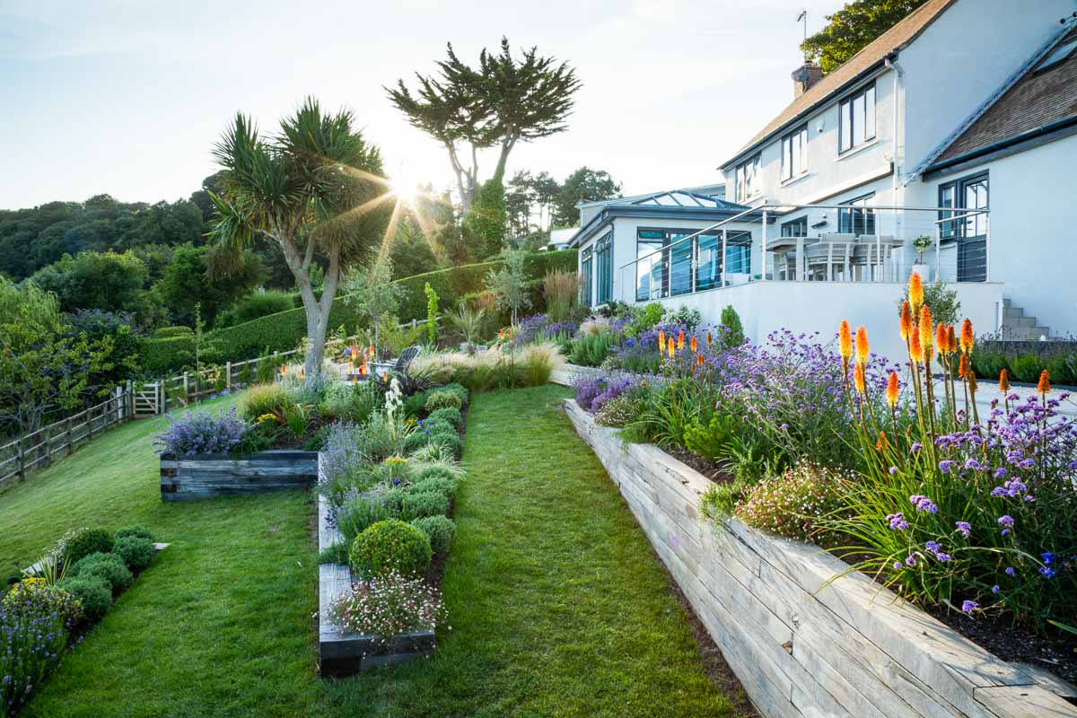 Located on the edge of Lyme Regis, Bay House has a small sloping garden that makes the most of its far reaching views over countryside and sea. Designer Alice Meacham has built an elegant set of terraces filled with coast tolerant planting, and a network of paths connecting several seating areas and a gravel garden on multiple levels. The grassed switchback path to the lower lawn is a particularly pleasing access solution on this steeply sloping site.