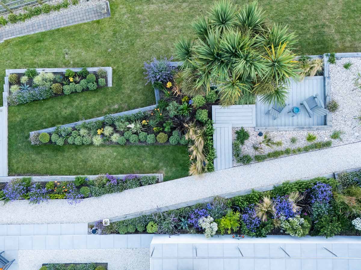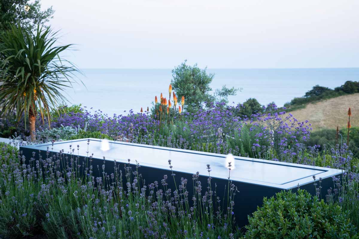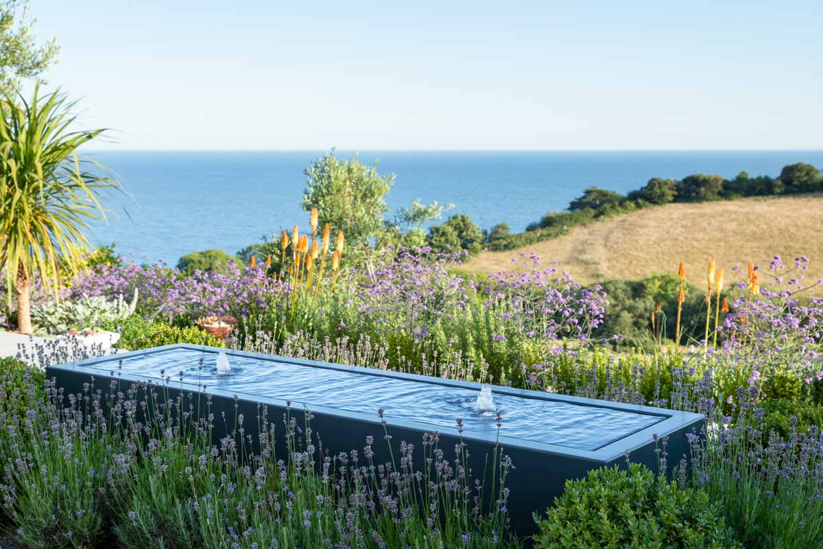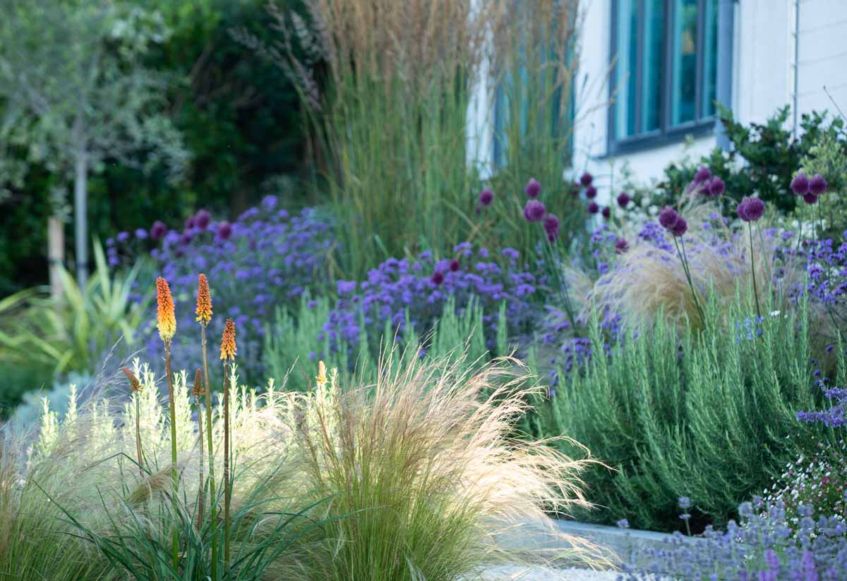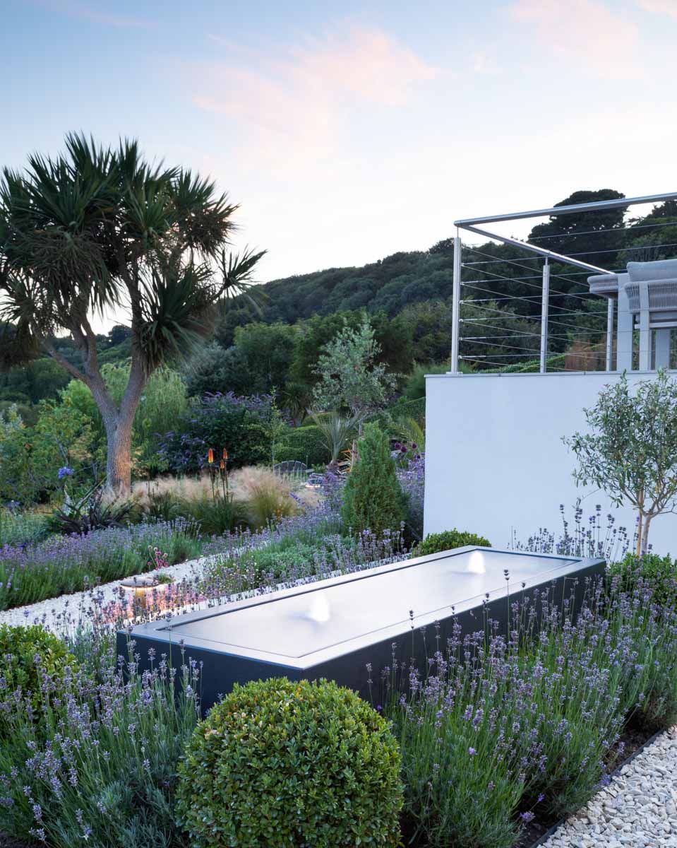 Located on the edge of Lyme Regis, Bay House has a small sloping garden that makes the most of its far reaching views over countryside and sea. Designer Alice Meacham has built an elegant set of terraces filled with coast tolerant planting, and a network of paths connecting several seating areas and a gravel garden on multiple levels. The grassed switchback path to the lower lawn is a particularly pleasing access solution on this steeply sloping site.