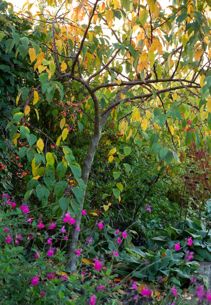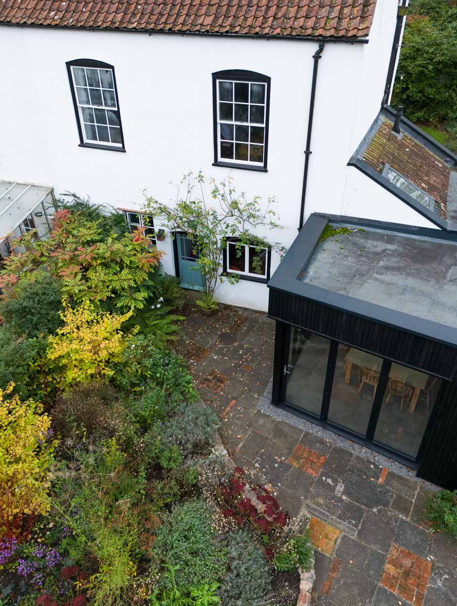 Double House is a listed period cottage in Bristol with a contemporary kitchen extension and a small cottage style garden full of pollinator friendly planting.  Dating from 1730, the house was once part of the wider Ashton Court Estate. The owners bought it at auction in 2016 in a sorry state and spent five years carrying out a sympathetic restoration using traditional skills and materials, saving and repairing as much as possible.  The garden was built by the owners on a shoestring budget, reusing saved materials from the restoration, and furnished with restored cast iron benches and tables.  The smaller rear garden was designed for sitting amongst the plants whilst the larger front garden was more child friendly, with play equipment incorporated into a large, mature hedge for more discretion and more fun! Planting was mostly 9cm pot perennials from the local garden centre and seed-raised plants, with a selection of bare-root trees and roses here and there for a bit of impact.