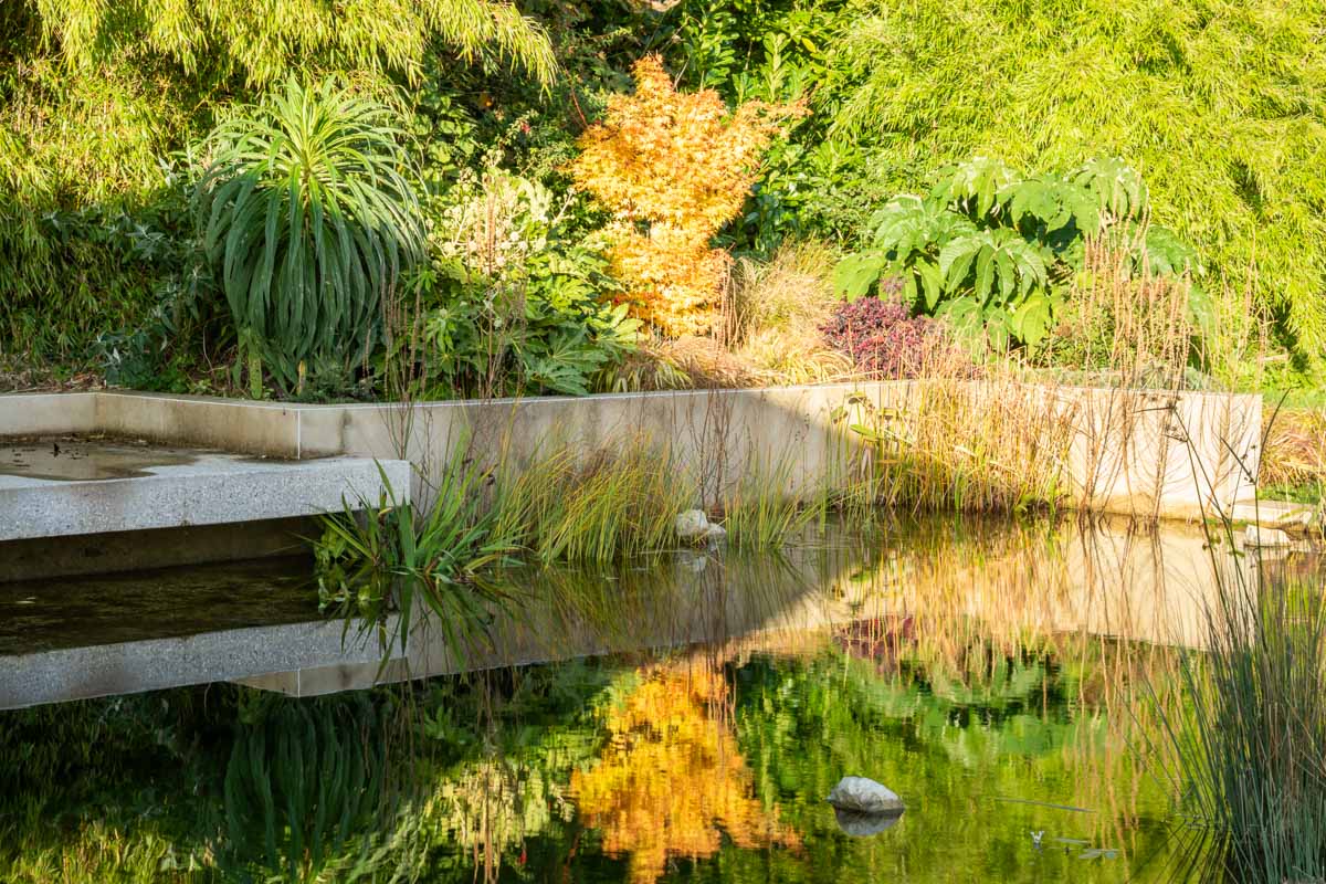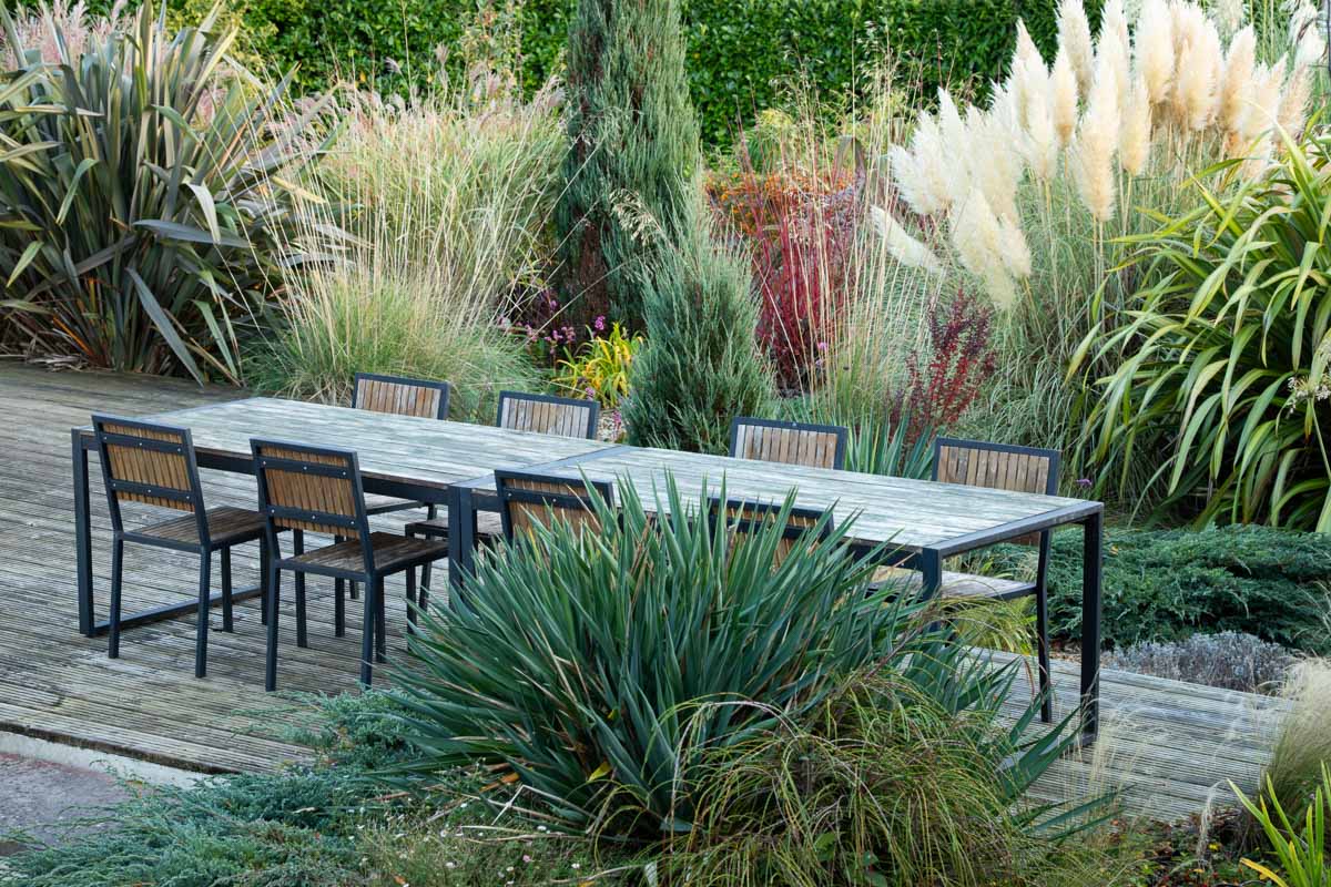 A sleek and stylish house of mid-century modern architecture nestled on a south facing hillside in Uplyme, the village just inland of Lyme Regis on the Dorset coast. The hard landscaping of concrete and wood takes its cue from the clean square lines of the house. Enclosing the house on two sides is an intimate gravel garden by local designer Alice Meacham, with a rich palette of textures and year-round interest using conifers and Phormiums, airy grasses, and autumnal colour splashes from dogwood and Acer. On the other side is a swimming pond whose surface reflects the shapely border planting of Echium and Tetrapanax. From here, the garden loosens into a relaxed area of grass and mature Acer whilst margins of bamboo achieve an impressive sense of privacy.